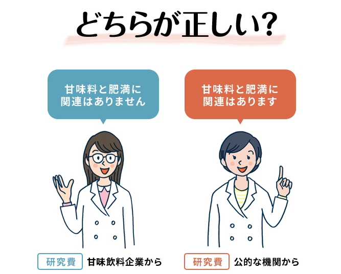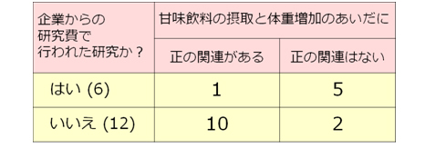 図1. 甘味飲料と肥満の関連を検討した複数の研究結果のまとめ:甘味飲料企業からの研究費で行われた研究の結果は、公的な研究費で行われた研究の結果と異なり、甘味飲料は肥満と関連がないとの結論が得られていました。