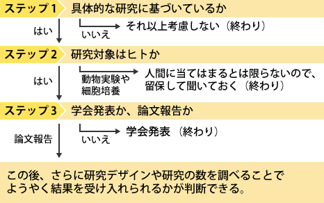 さらに情報の中身までよく吟味して判断したいと思われる方は、図2のフロー(文献2)に従って判断するとよいかもしれません。ヒトを対象にしているか、学会発表か論文報告かなどの基準を使うと、現時点で受け入れられる情報というのは意外と少ないことに気づくかもしれません。