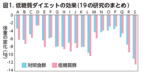肥満の人たちを低糖質食と他のダイエット食(低脂質等の対照食)を摂取する群に分け、それぞれの群の体重変化を調べた結果をまとめた研究があります(文献1)。研究( A ~ S )ごとに、研究実施前後の体重の変化量を図1に示しました。どの研究でも低糖質群で体重の減少が見られます。ところが、対照食群でも体重は減少していて、低糖質群の結果とほとんど変わりません。これらの研究から、低糖質でも他のダイエット食でも、効果はほぼ同じであることが分かります。 -