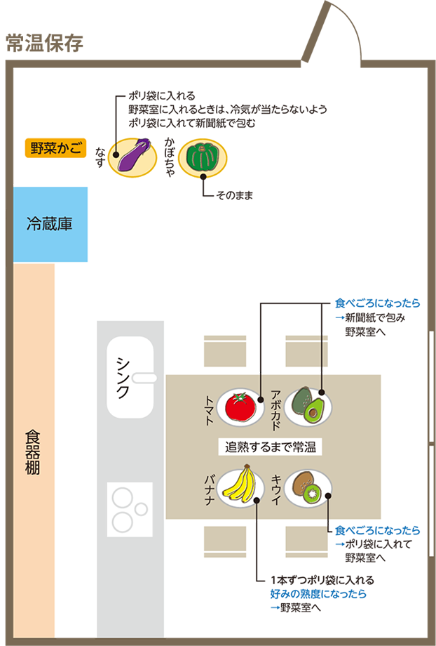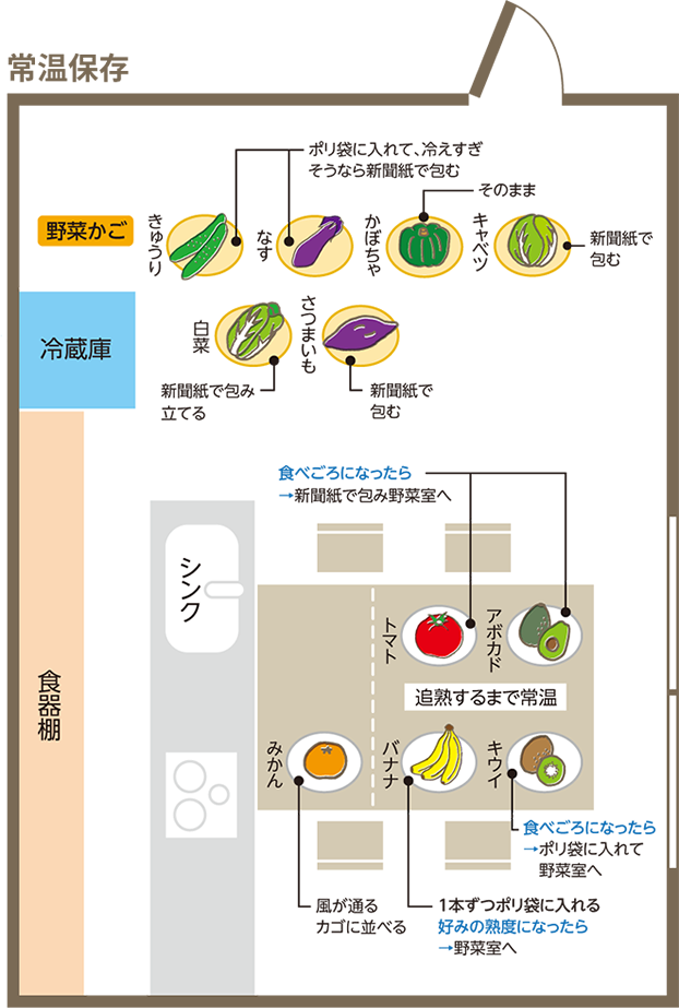 常温でも保存できるもの、ラップで包めば野菜室で保存できるものなど、