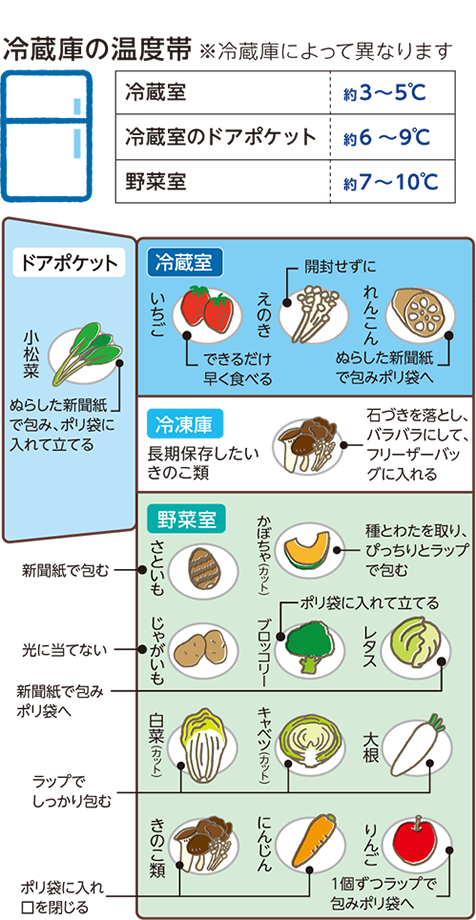 野菜やカットの状態に合わせて保存場所を工夫しましょう。
