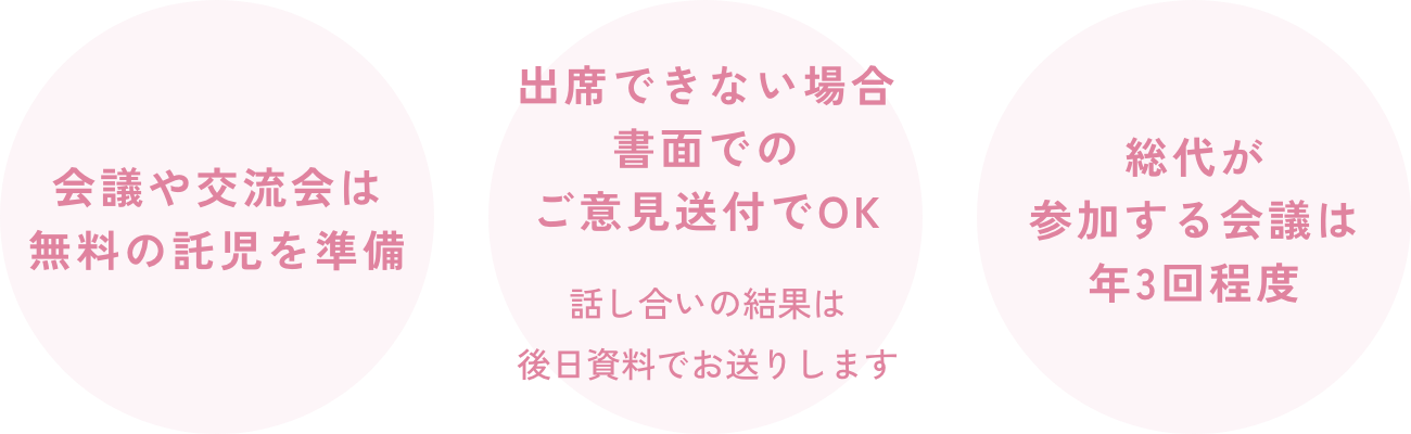 総代が参加する会〈総代会議・地域別議案検討会・総代会〉には託児(生後6か月以上)を設けているので、小さなお子さんがいらっしゃっても安心して参加できます。