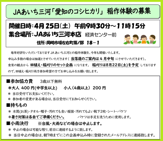 JAあいち三河稲作体験の参加募集のお知らせです♪