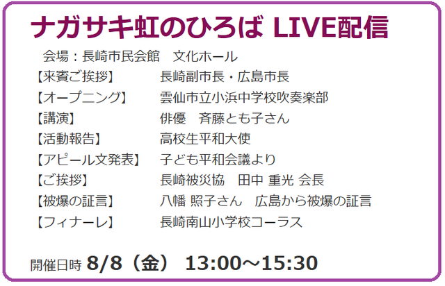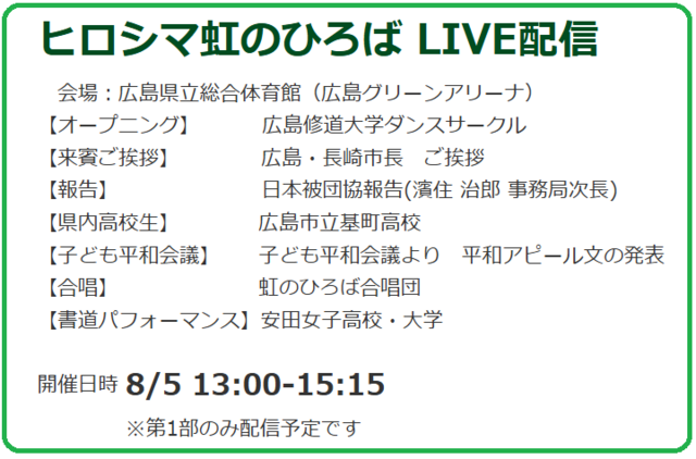 8月5日(火)のヒロシマ、8月8日(金)ナガサキの「虹のステージ」がオンライン配信されています。