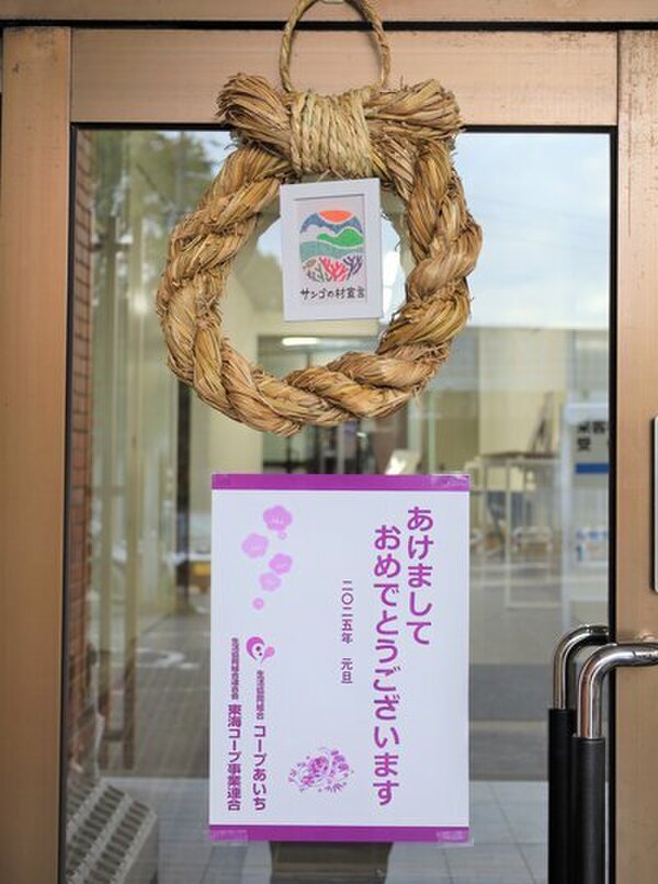 コープあいちの正面玄関には、沖縄県恩納村からいただいた地元農家の方の手作りの「サンゴの村バイオスリース」を飾っています。