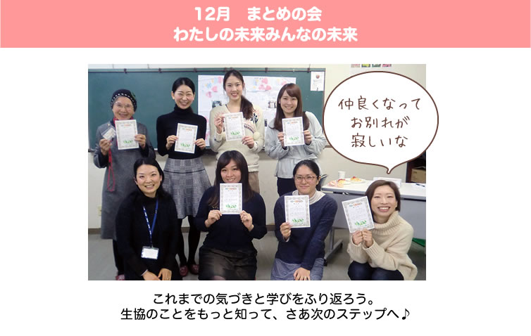 違う年齢の子どものママと話せることと、毎回のおやつが楽しみでした。コープひろば修了後につくったグループでは、みんなと相談して、やりたいこと、やってみたいことができるのがとっても楽しいです。昨年は離乳食商品の学習会を主催しました。