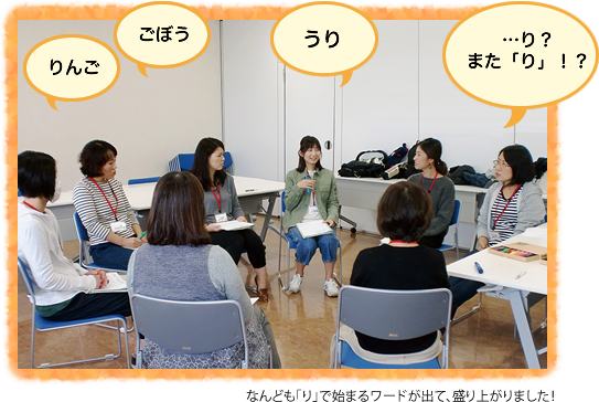 「食べ物しりとり」でおしゃべり前に緊張をほぐします。