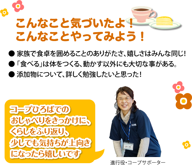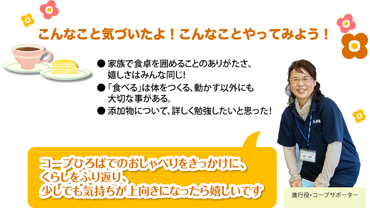 コープサポーター(進行役)がいるので、1人で参加しても大丈夫。
