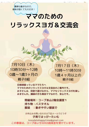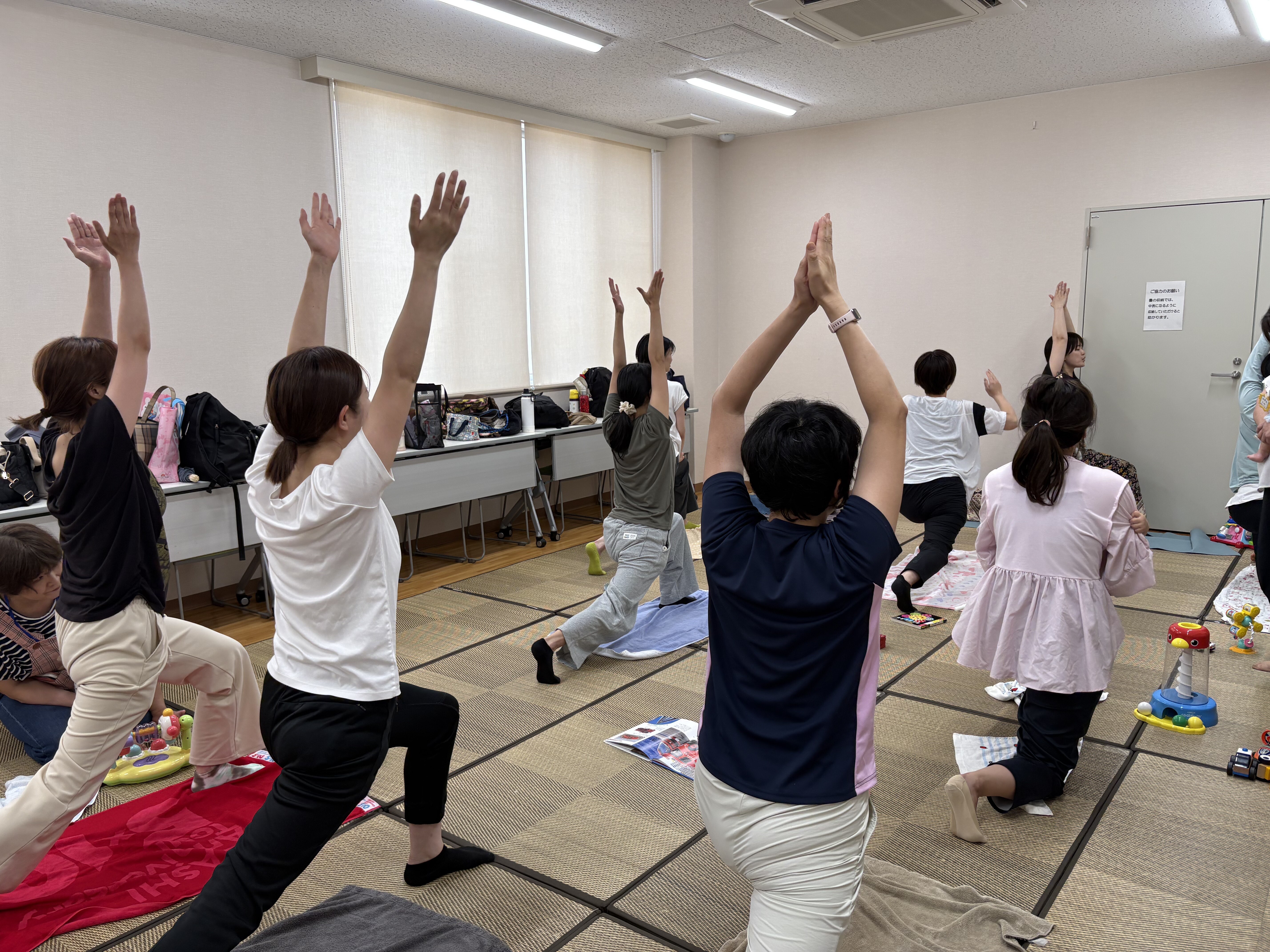 お子さんも同室で遊ばせながら、ヨガ体験でした。まず初めに自己紹介(自身とお子さんの名前、月齢、はまっていること)を行い、和やかな雰囲気の中で楽しんでいました。